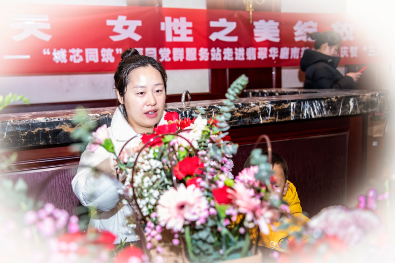 活動(dòng)現(xiàn)場氣氛熱烈而融洽,居民們邊向老師學(xué)習(xí)邊交流,互相分享自己的插花心得。一朵朵美麗的花朵在大家的手中綻放,仿佛也在訴說著女性的堅(jiān)韌與美麗。