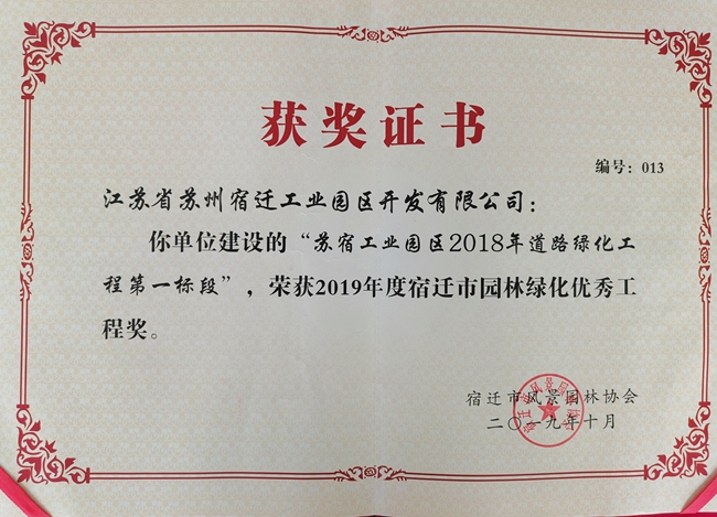 蘇宿工業(yè)園區(qū)2018年道路綠化工程榮獲“2019年度宿遷市園林綠化優(yōu)秀工程獎(jiǎng)”稱(chēng)號(hào)