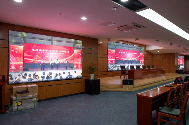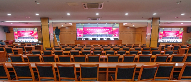 經過改造,安全教育館新增3塊LED屏幕,其中主席臺處主LED顯示屏面積約20平方,東西兩側輔助LED顯示屏各約6平方。LED屏幕采用顯示單元像素間距為P2-2.5,具有顯示面積大、分辨率高、超高對比度、超寬視角、無縫拼接、維護方便等優(yōu)點。改造后進一步提升了視頻會議效果,增加了會場多功能性。