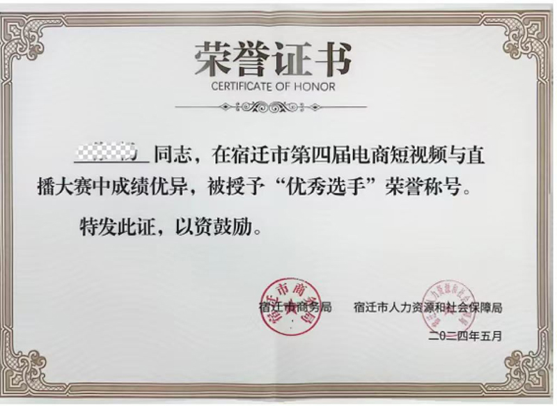 榮譽(yù)證書(shū)得獲得不僅是對(duì)參賽選手個(gè)人努力和才華的認(rèn)可,也是對(duì)蘇宿電商園在電商領(lǐng)域?qū)I(yè)人才培養(yǎng)和推動(dòng)電商直播行業(yè)發(fā)展的成果的肯定。