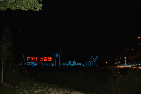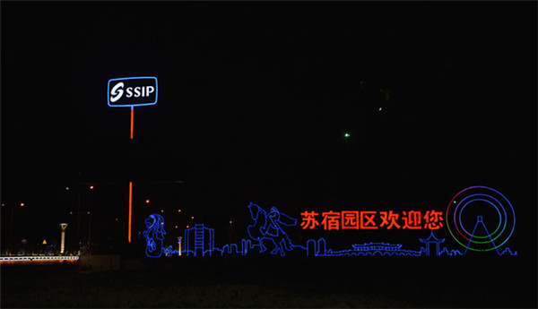 在園區(qū)東入口為民河的一畔,一座座生動(dòng)的城市剪影燈光造型在青海湖西路兩側(cè)一字排開。有象征著新加坡元素的“魚尾獅”,有蘇州工業(yè)園區(qū)金雞湖畔的東方之門、摩天輪和李公堤,還有西楚霸王項(xiàng)羽騎馬的颯爽英姿。造型以蘇州、宿遷和新加坡城市建筑輪廓線、城市主題雕塑為基本元素,以剪影形式為載體,以現(xiàn)代高科技LED燈光為表現(xiàn)手段,通過炫麗動(dòng)感的光影效果,在夜色中描繪出了一副靚麗多姿的畫卷,生動(dòng)地展現(xiàn)出了園區(qū)“從新加坡到蘇州再到宿遷”和“在宿遷、為宿遷”的發(fā)展理念。