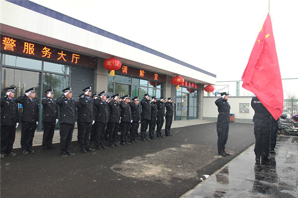 2月8日上午8時50分,根據(jù)第三次“忠誠教育周”活動安排,園區(qū)分局全體民警、輔警在分局辦公大樓前冒著大雪舉行升國旗等“忠誠教育周 ”主題活動。